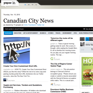 Simply, per their site, “paper.li organizes links shared on Twitter into an easy-to-read newspaper style format. Newspapers can be created for any Twitter user, list or #tag (hashtag).”